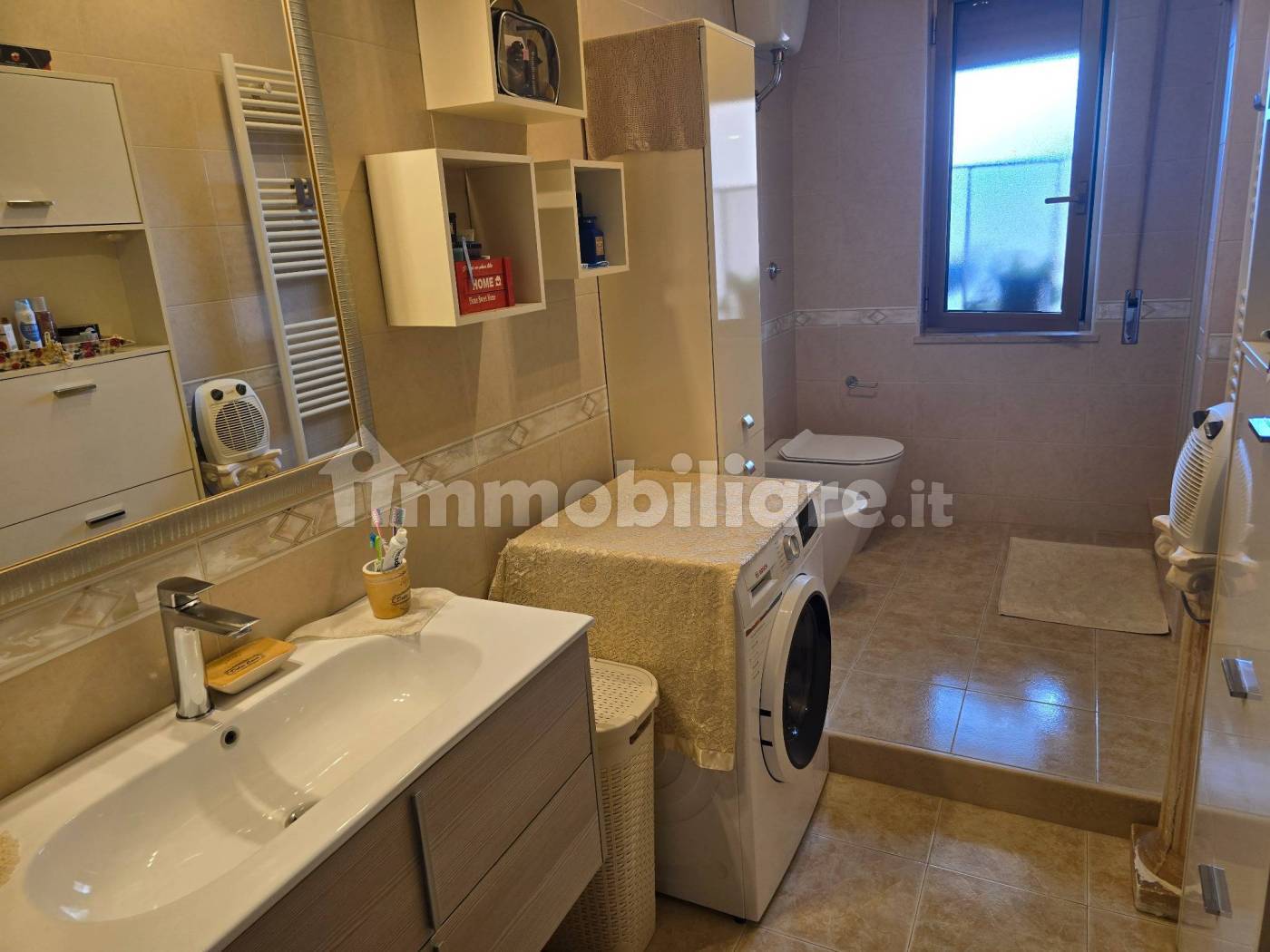 Bagno con sanitari, lavandino, box doccia e spazio con scarico per lavatrice.